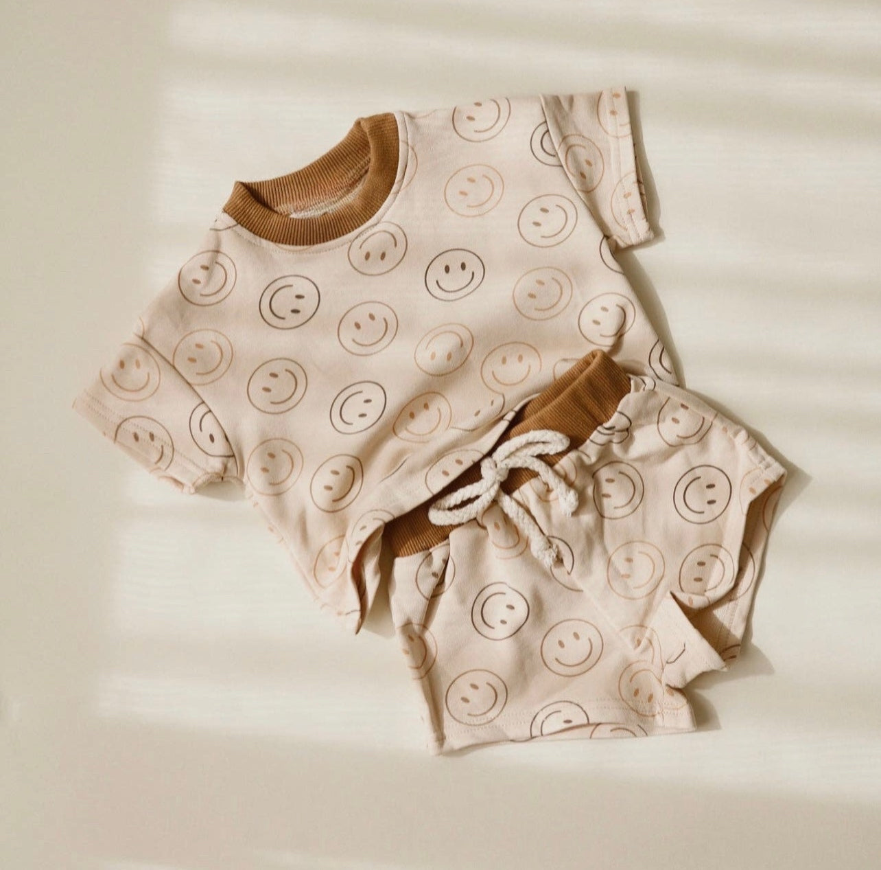 This high-quality set includes a Smiley print t-shirt and shorts that fit true to size; furthermore, it is comfortable and classic, making it an easy set to throw on. manufactured by Aziel & Luca